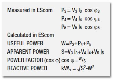 EScom is the communications module. In addition to phase voltage and line current, the individual phase angles are taken into account, and real power is calculated for each monitored line. In the case of monitoring, for example, for a three-phase motor, whether star or delta-wired, the EScom can provide total real power consumed, apparent power, overall power factor as well as reactive power.