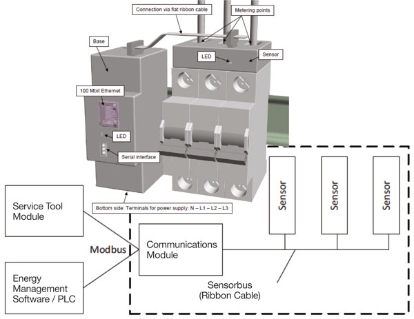 The significant advantage of the EnergySENSE philosophy is that it be adaptable to virtually any type of distribution board and circuit breaker. This is in sharp distinction to devices with similar analysis tasks which, however, are designed to be incorporated as part of the circuit breaker, or can only be installed on a limited range of devices. In fig 3 and 4 sensor modules are shown for three and twelve-circuit sensing assemblies, capable of being mounted on any distribution board.