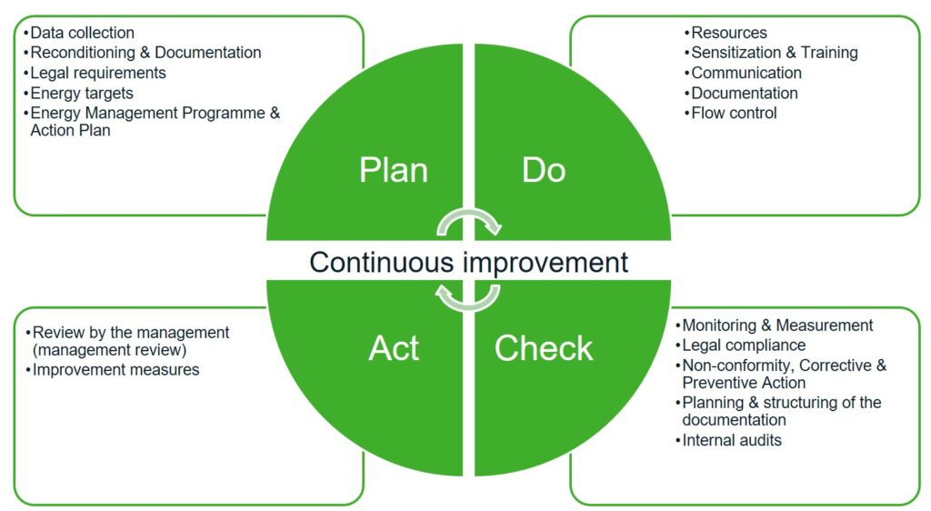 With the help of a continuous improvement process based on the PDCA cycle (plan-do-check-act), the company’s energy process and energy saving measures are planned, analyzed, evaluated and, if necessary, improved. Knowledge concerning energy consumption at one’s own company is an important factor. Only those who know where and why energy is consumed at a company are able to develop and implement options for improvement. All of the necessary activities can take place simultaneously – even the decision concerning which activity to begin with depends on the company’s circumstances.