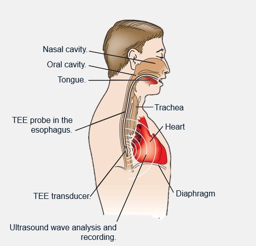 In contrast to transthoracic echocardiography (TTE), TEE examinations are not performed through the chest wall, but through the oesophagus using an endoscope-like examination tool. The esophagus runs directly behind the heart, so that the distance to cardiac structures is significantly less than by conventional echocardiography. The structures in front of the heart (e.g. ribs, fatty and connective tissue, etc.) are omitted in TTE, so that interference signals are minimized. This means that particularly high-resolution transducers can be used, which make even the smallest structures and changes visible. However, as these transducers only have a very low penetration depth, a transthoracic examination is not possible.