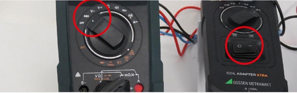 3. After selecting the appropriate inductance range for the winding with the rocker switch at the COIL ADAPTER XTRA and setting the METRAHIT IM to RISO, the process can be started.