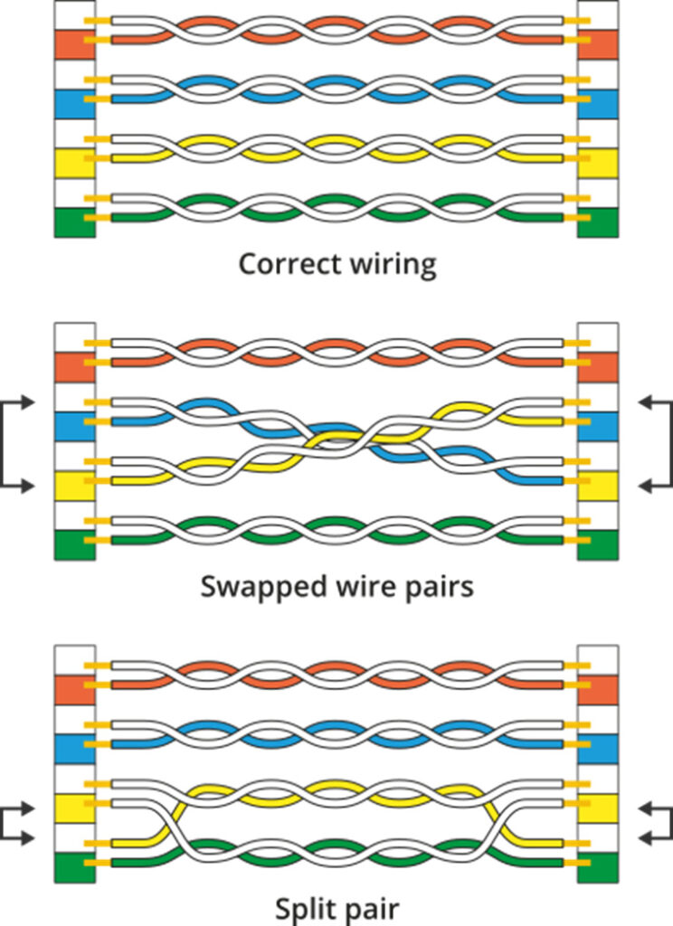 Fig. 5: Exemplary faults in the wire assignment and a wiremap in the display of a KE7200 Network Tester