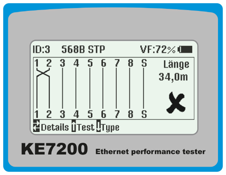The basis of measuring a network cable is the verification. During verification, the actual cabling is checked. There are different designs of cabling testers. In principle, coded signals are fed into individual wires and the shield by a transmitter. These signals are received and evaluated at the other end of the cable. Thus wiring errors for continuity, interruption, short circuit or interchanging are displayed. The display is device-dependent, for example in tabular or graphical form. The graphical display of a wiremap, as shown in the KE7200 display, facilitates error analysis and correction.