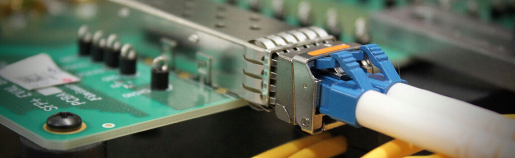 The abbreviation SFP stands for “Small Form-factor Pluggable”. An SFP is a standardised transceiver module. SFP modules can be used, among other things, to enable network connections with Gbit/s speeds. Both multimode and singlemode fibre optic cables can be connected. The most common connector type used is an LC connector . Visually, the connectable fibre optic cable can also be recognised directly by the coloured bracket of the SFP, as can be seen in Figure 1. A blue bracket usually signals the use of a single-mode cable, black brackets indicate a multimode cable. Currently there are three classes of SFP modules, which are defined by their transmission speeds. SFP28 has another special feature and can transfer the data rate to four so-called lanes. In this case, there are four times 25 GBit/s. An SFP28 module can also convert a 100 GBit/s port into four 25 GBit/s ports.