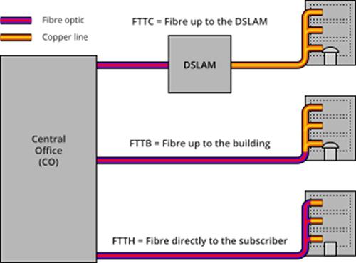 Fig. 1: Forms of FTTx: FTTC, FTTB and FTTH