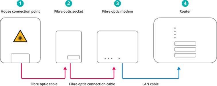 Fibre optic modems are required if, as with FTTH, the fibre optic cable is extended to the customer’s home. In this case, the fibre optic cable is routed from house connection point to the fibre optic socket (2) in the flat. The corresponding fibre optic modem (3) is then connected to this socket via a fibre optic cable. The router (4) is connected to this via a LAN cable. (See figure 5)