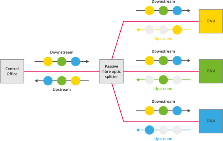GPON and the data transmission can be realised via one or two fibres. If two fibres are used, one fibre is reserved for the downstream and one for the upstream. However, it is also possible to realise the downstream and the upstream via one fibre. In this case two different wavelengths of optical transmission are used. For the downstream the wavelength is 1490 nm, for the upstream it is 1310 nm.