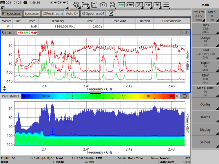 Fig. 2: Wi-Fi 2.4 GHz, spectrum and persistence, single channels visible (SignalShark – Narda Safety Test Solutions GmbH)