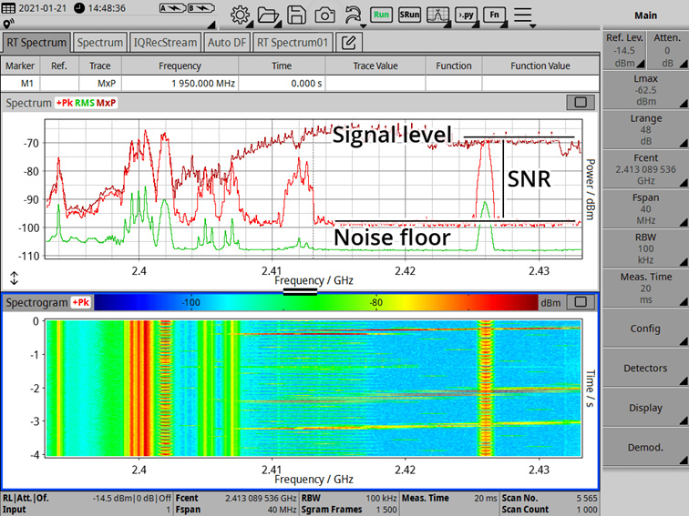 There are different approaches to the signal parameters. For a rough overview and initial assessment, start with a look at the signal strength. If the signal strength is low, the data transmission rate decreases. The next step is to check the choice of channel. Are there possibly other Wi-Fi networks operating on the same channel or close to it? If so, one should change one’s own channel and, if possible, realise a distance of 3 channels so that no overlapping occurs. If these simple checks do not lead to a result, deeper analyses are necessary, which are often only possible in connection with special measurement technology. One possibility is to look at the SNR. The abbreviation SNR stands for “signal-to-noise ratio”. Within communications technology, this is a well-established means of analysing a signal. In the spectral view of a signal or frequency band, the level of the noise floor is an important indicator. If the noise floor is too high in relation or, conversely, the signal level is too low and thus the distance between the two is too small, either interference or communication interruptions can occur.